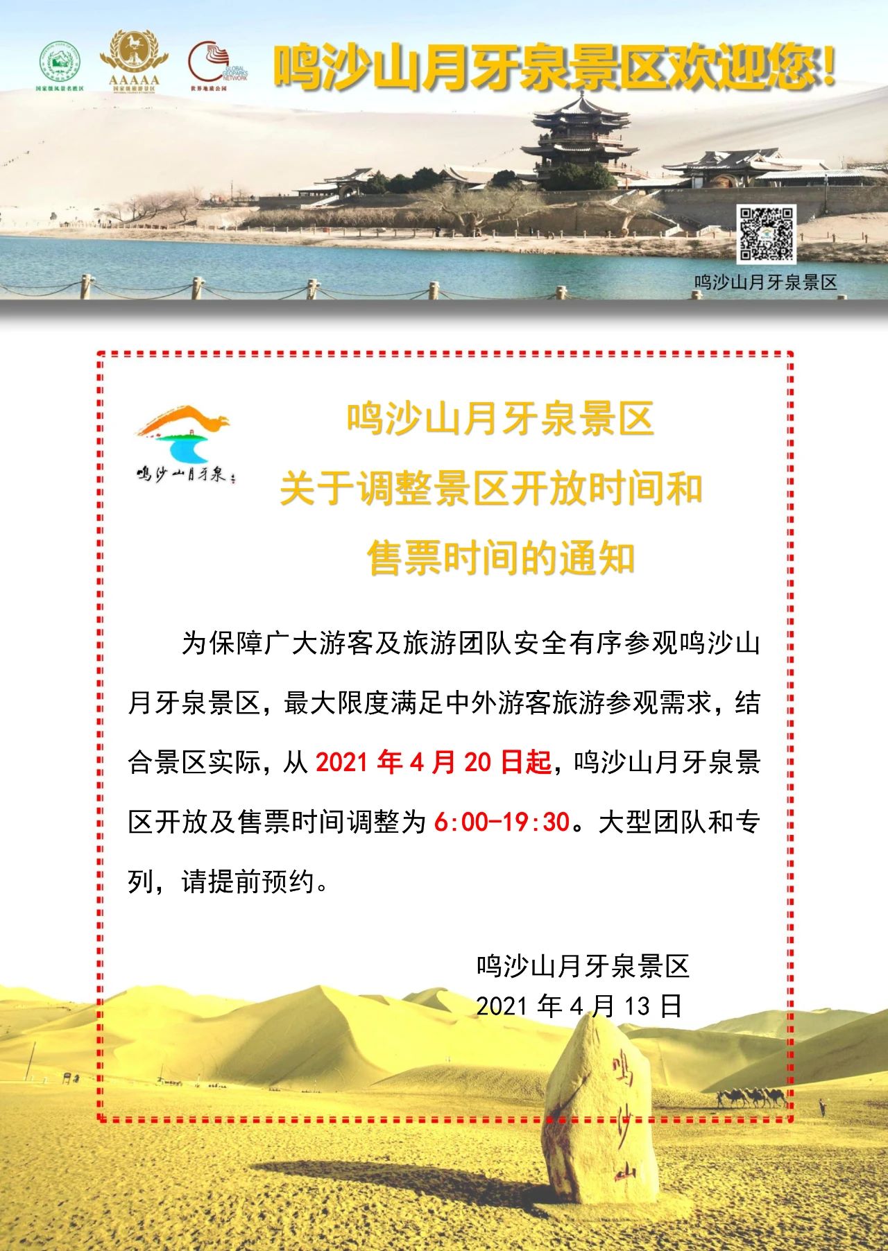 | 鳴沙山月牙泉景區(qū)關(guān)于調(diào)整景區(qū)開放和售檢票時(shí)間的通知 |