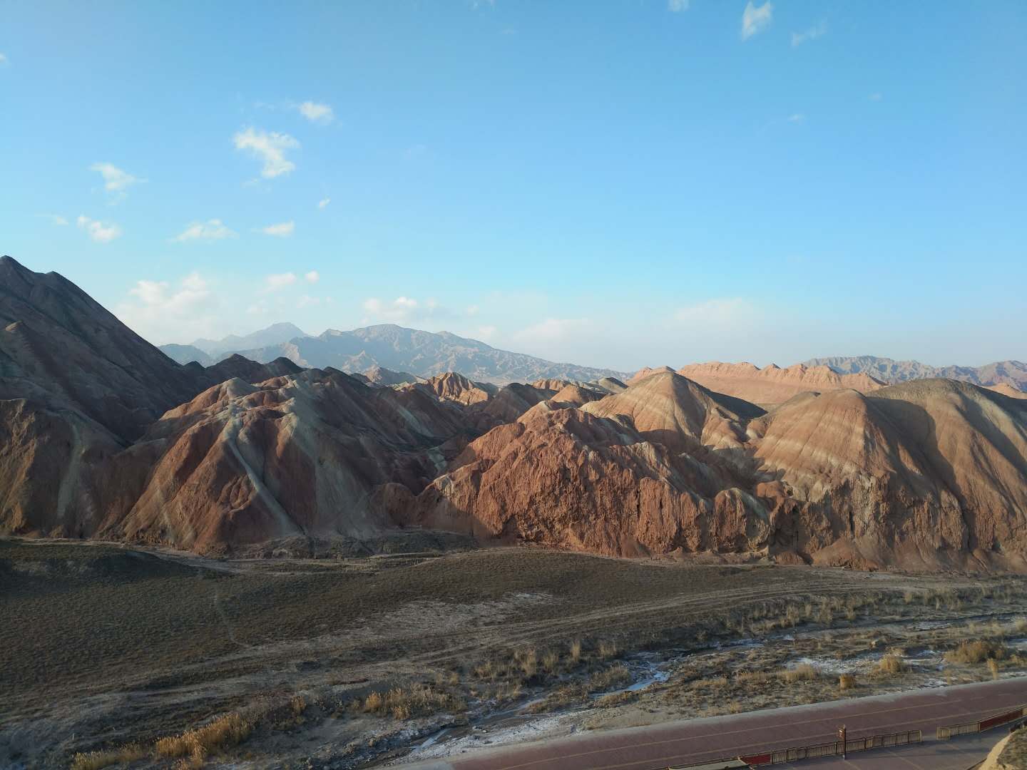 15:30抵達七彩丹霞景區,導游統一換票后,進入景區參觀游覽。景區以層理交錯、氣勢磅礡、色彩斑斕的七彩地貌而稱奇。在陽光照射下彩色丘陵遠遠看似朝霞升騰,近看如彩虹落地,有紅色、白色、黃色、褐色等紋理,色帶隨著山勢起伏呈波浪狀,猶如艷麗的彩帶隨風蜿蜒飄動,像大地噴灑炙焰烈火,似山巖披上五彩霓裳,讓人嘆為觀止。19:30七彩丹霞景區門口集合,乘車前往張掖市區19:30左右抵達。